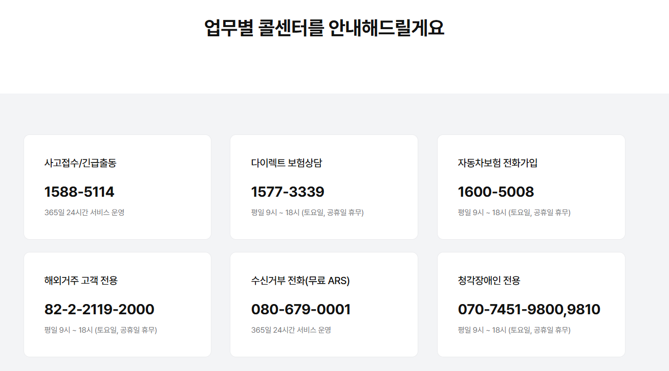 - 자동차 사고 접수: 대표번호 연결 후 ARS에서 ‘1번’ 선택